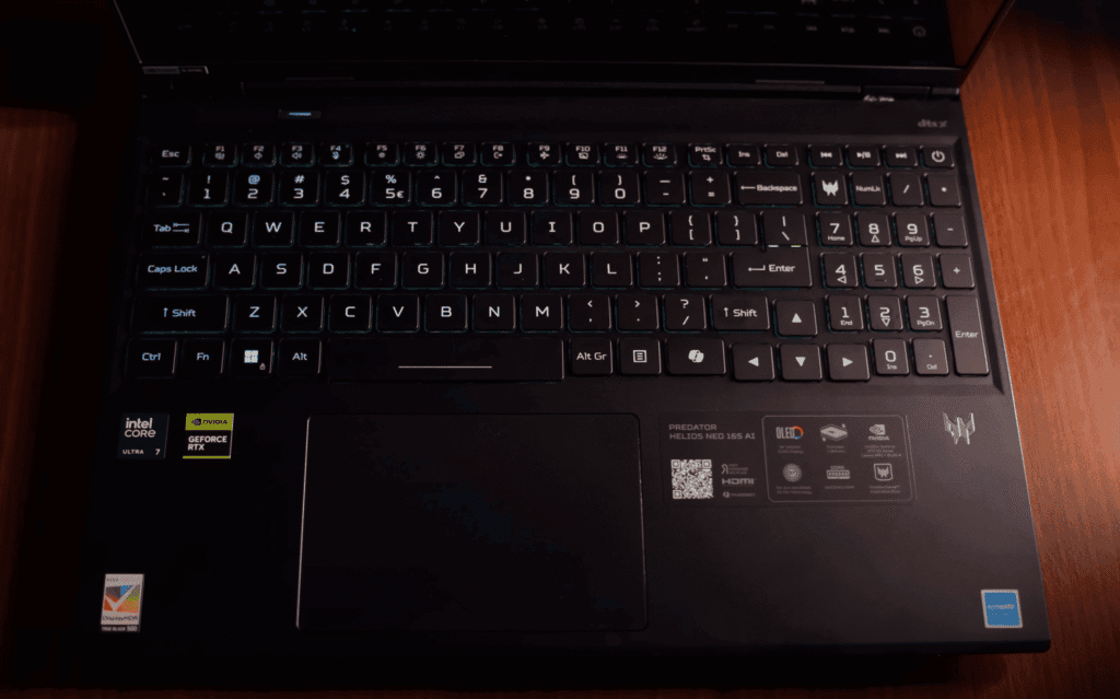 Since this is a 16-inch laptop, it comes with a full-size keyboard. The keys feel solid and responsive, with 1.5mm key travel that makes typing comfortable for both work and gaming. It features a 4-zone RGB backlight, fully customizable through the Predator Sense software, allowing you to set colours and effects to your preference. There’s also a dedicated Copilot key for quick access to AI features.