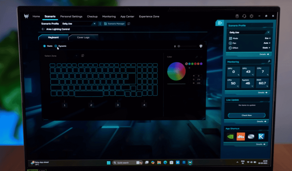 And first of all, let’s start with the design. This Acer Predator Helios Neo 16S AI carries the proper Predator feel. The top lid is metal with the Predator logo, and both the top and bottom are made of aluminium. The keyboard area, however, is polycarbonate. The Predator logo on the lid comes with RGB lighting, which you can customize. It supports Static, Breathing, and Neon effects, with adjustable colours and brightness. You can even sync the keyboard and logo lighting together or set them separately.