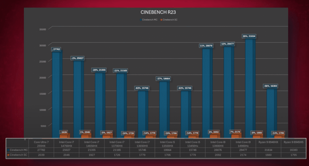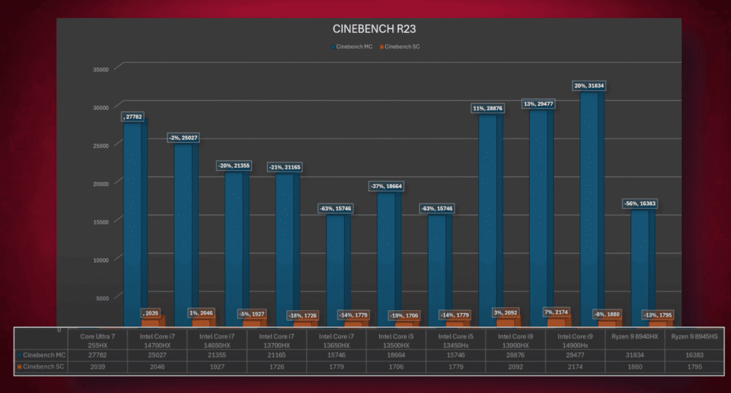 Acer Predator Helios Neo 16S, which we have now. With the Intel Core Ultra 7 255HX processor. The CPU has 20 cores and 20 threads with 8 performance cores and 12 efficiency cores, delivering excellent multitasking and gaming performance. Benchmarks clearly show its strength. If we compare it with a competitive processor, you can see the graph here. It has a good performance.