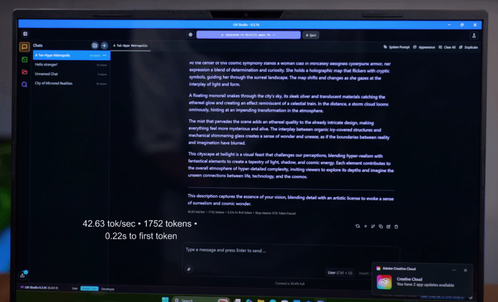 - we tested Deep-Seek R1’s 7B model through L-M Studio, and the output came in about 41 seconds. (I’ll add the token-per-second details in the images for reference.)