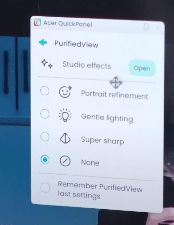 The webcam supports Windows Studio Effects, including automatic framing, eye contact correction, and background effects. You also get Acer’s PurifiedView features directly from the quick panel, which include portrait mode, refinement, gentle lighting, and super sharpness. These enhancements can improve your appearance during online meetings or classes.