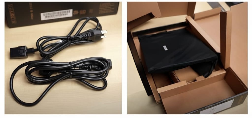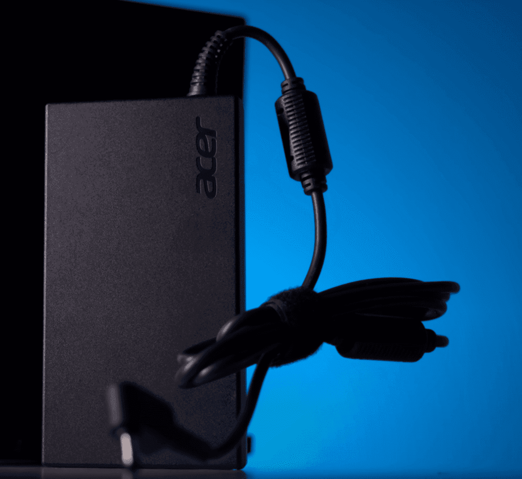 As soon as we open the box, we see two power cards, one with a foreign plug and one with an Indian plug and a heavy charger, which is 230 watts. Now, here’s our Acer Predator Helio Neo 16s. Wow, it’s so thin. And surprisingly light. It doesn’t even feel like a gaming laptop. This model is clearly targeting a different type of user, because it comes in a thin form factor while still packing good power.