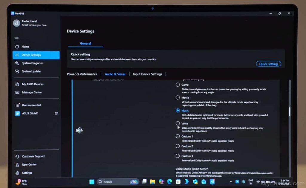 Users can further customize audio output using the Dolby app and MyASUS software, where multiple sound modes are available to fine-tune the listening experience based on usage.