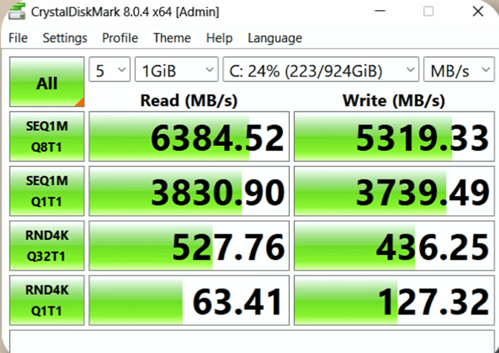 For storage, you get a 1TB Gen 4 SSD, which is great because laptops in the $1,200 range often ship with only 512GB. Read and write speeds are strong, and the laptop includes two SSD slots.