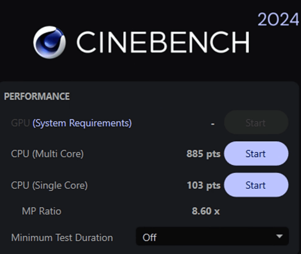 Blender Benchmark scored around 2900 and the BMW render finished in 25 seconds. Good for entry-level game development depending on project complexity.