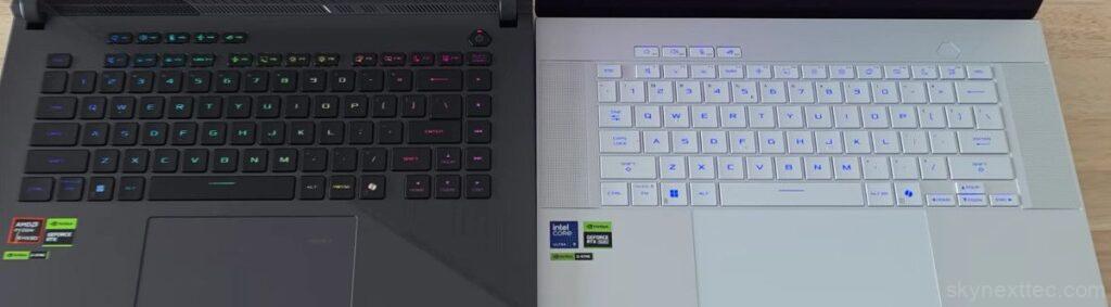 Typing experience is excellent on both. The Zephyrus feels slightly more clicky, while the Strix feels deeper and more cushioned. The Strix also includes extra keys and full-size arrow keys, which some users may prefer.