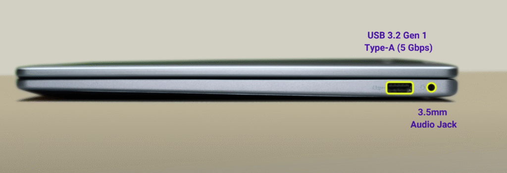 On the right side, you get a 3.5 mm headphone jack and a USB Type-A port.