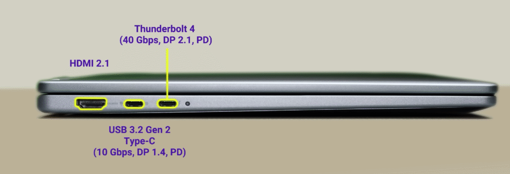 - Left side: HDMI, Thunderbolt 4 USB Type-C, USB 3.2 Gen 2 USB Type-C (supports charging)