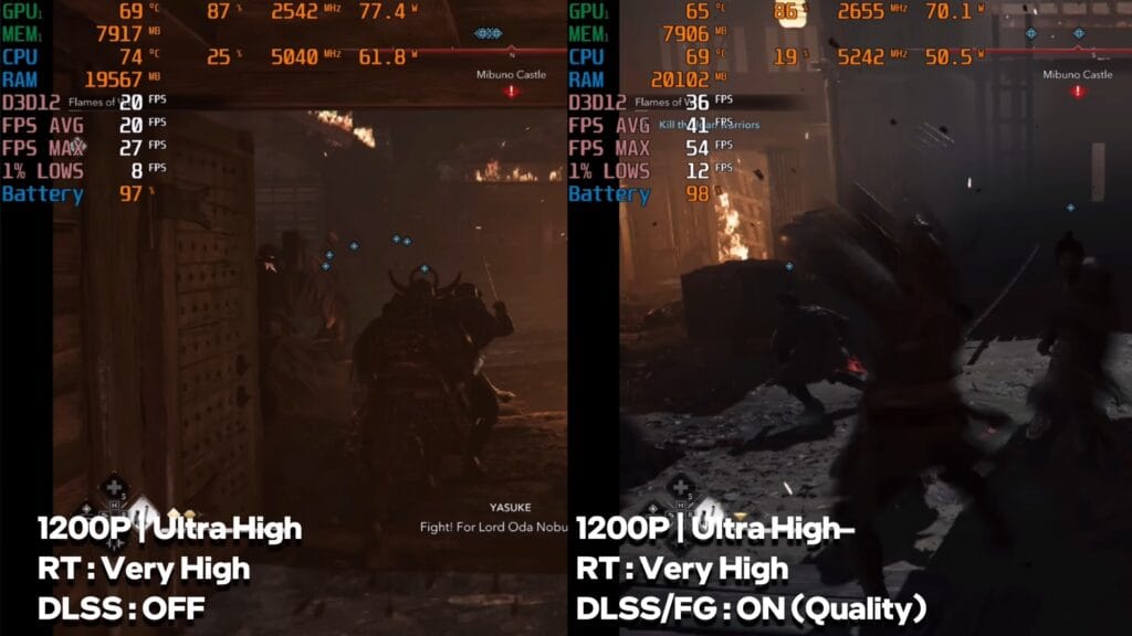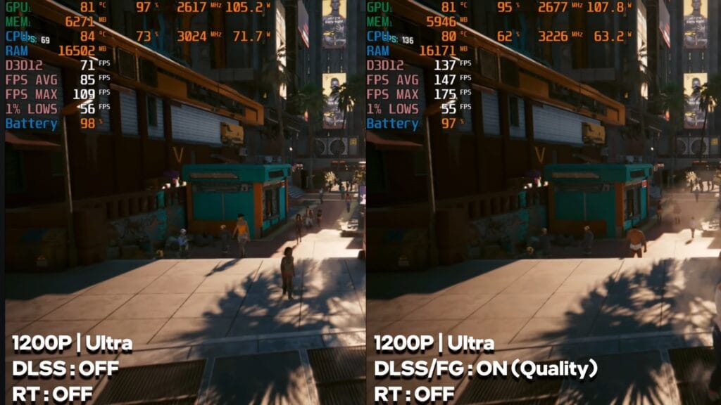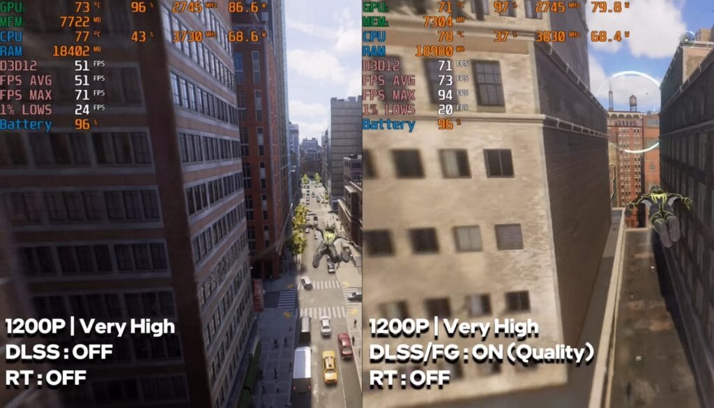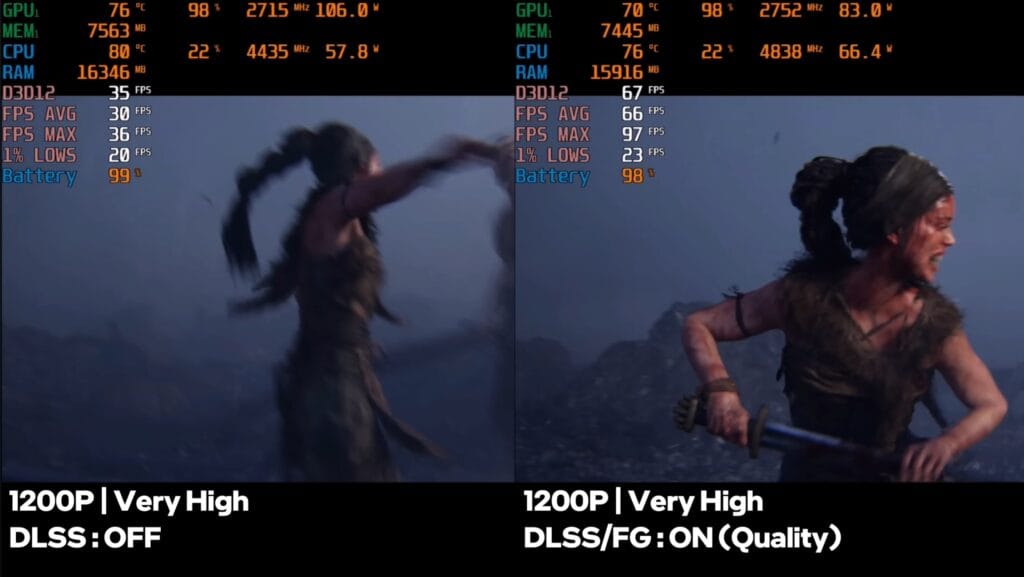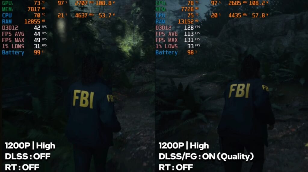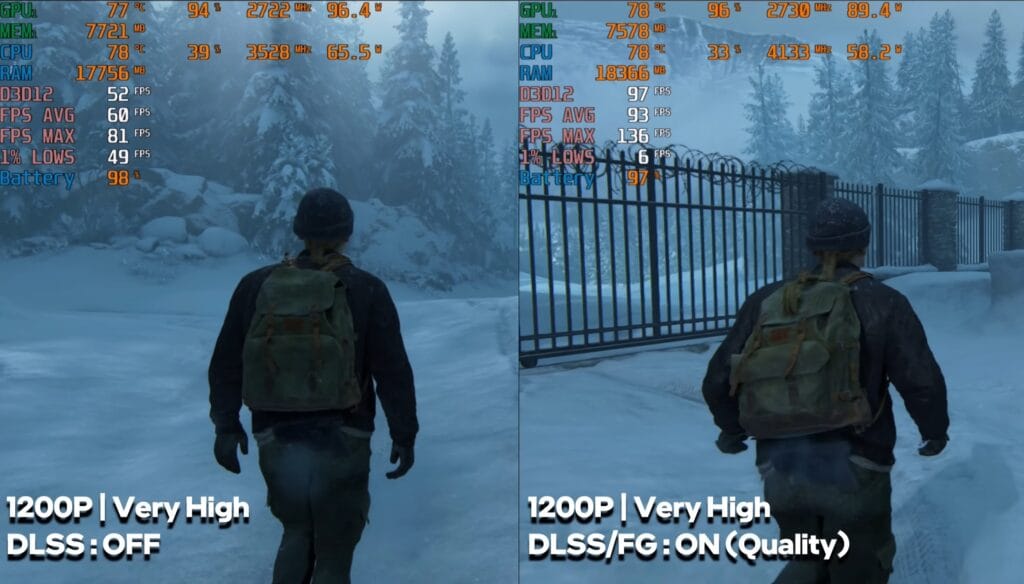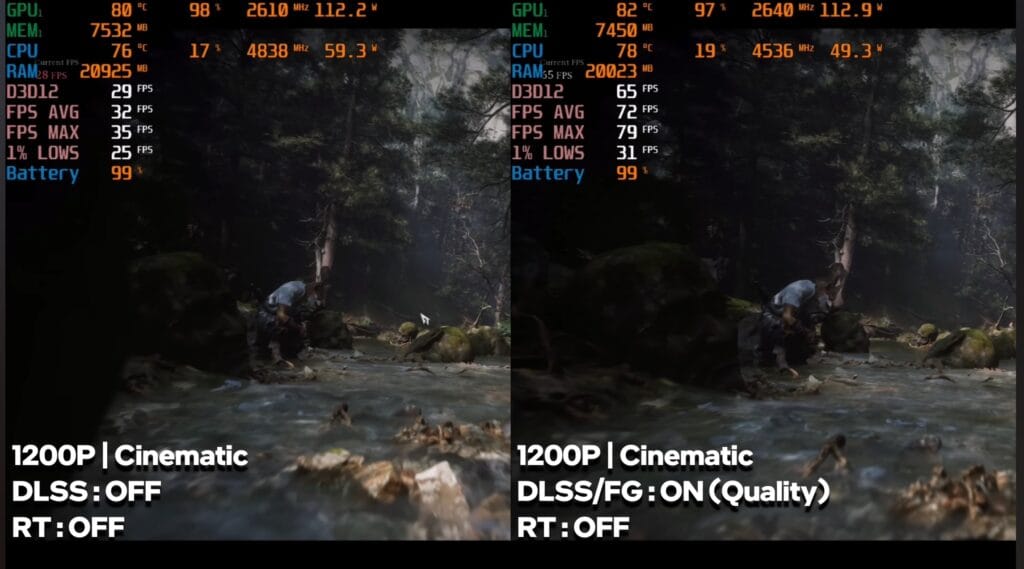 This title ran smoothly at playable FPS in both raw performance and frame generation modes, showing the laptop can handle demanding narrative-driven games well.