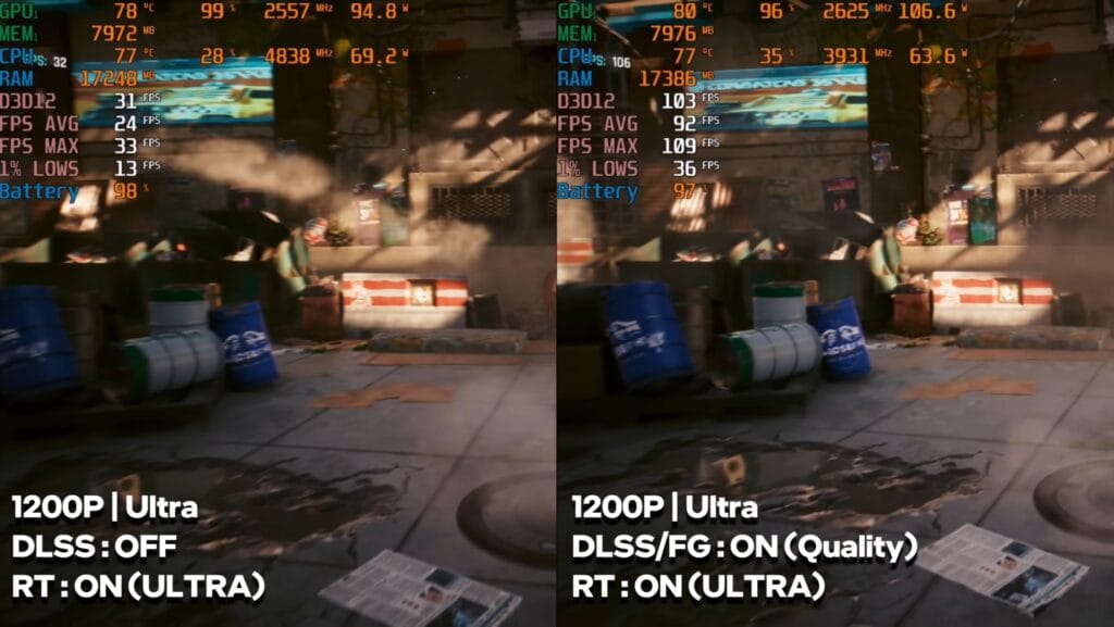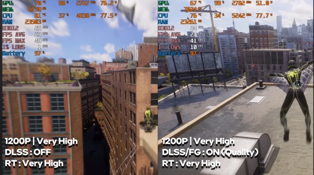 Without DLSS, performance was low at 20–25 FPS, so settings need to be reduced for playable FPS. Frame generation improved it slightly, but for smooth gameplay, lowering ray tracing or detail settings is necessary.