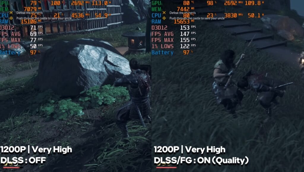 Ghost of Tsushima ran at 70–80 FPS raw. Using frame generation, it jumped to 140–150 FPS, delivering smooth, high-frame-rate gameplay.