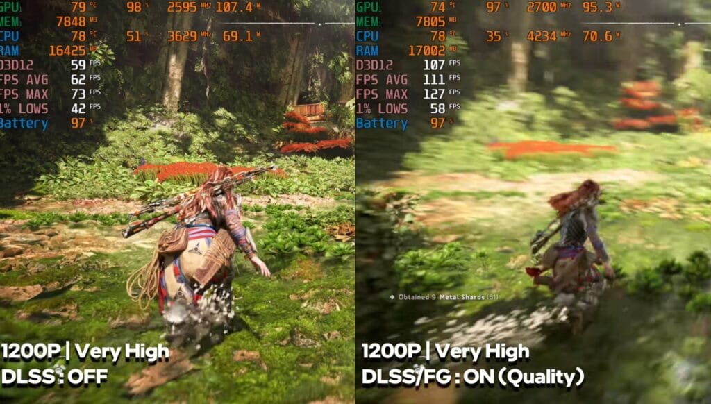 On very high settings, Horizon Forbidden West averaged 60 FPS without DLSS. Frame generation boosted it to around 100 FPS, though there were minor drops (1% lows) in raw performance.