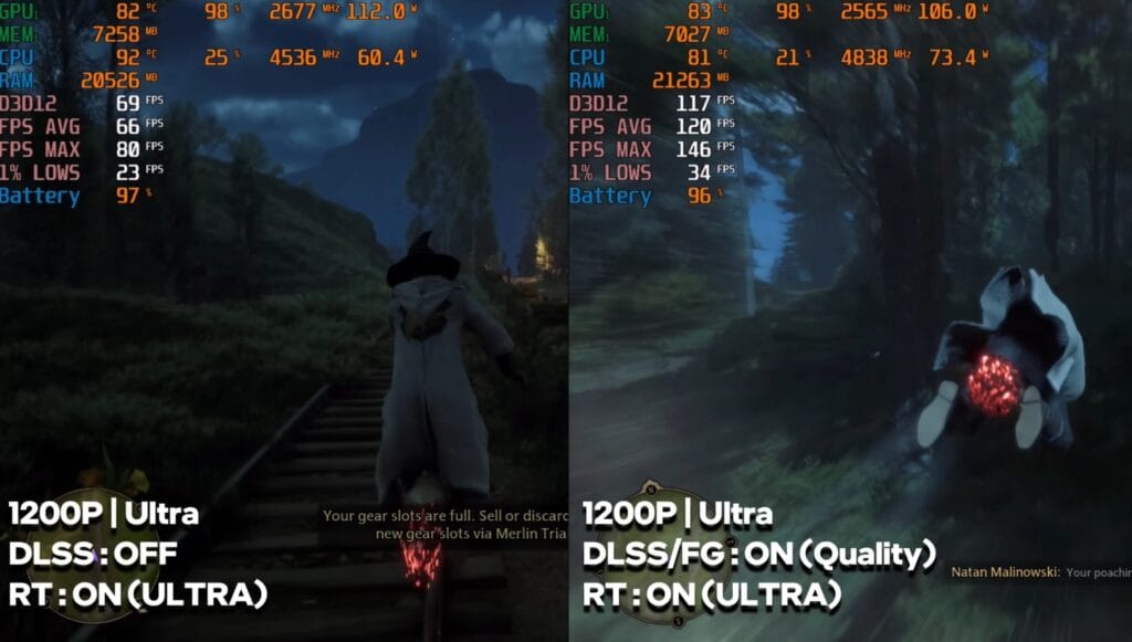 Hogwarts Legacy ran at 50–55 FPS with ultra settings and ray tracing. Using frame generation, performance jumped to 100–120 FPS, allowing for smooth gameplay without compromising visuals.