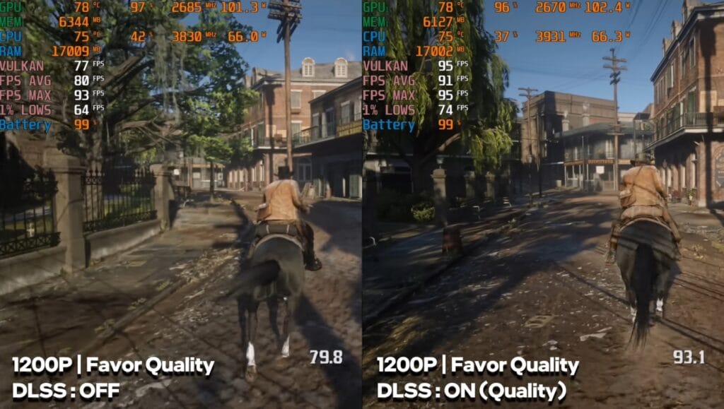 Without DLSS, RDR2 averaged 80 FPS on favor quality. With DLSS quality enabled, the frame rate increased to around 90 FPS, making for smooth and visually pleasing gameplay.