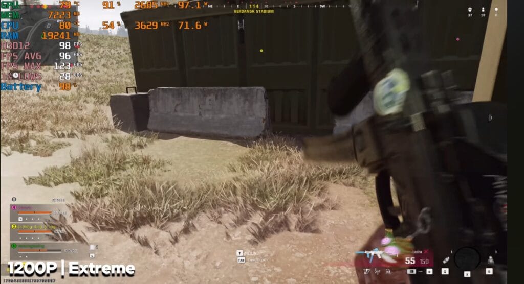 On extreme settings, Warzone ran between 90–100 FPS. The CPU maintained around 70W, and the GPU hit 90–100W. The laptop thermals were well-managed, making it comfortable for long sessions.