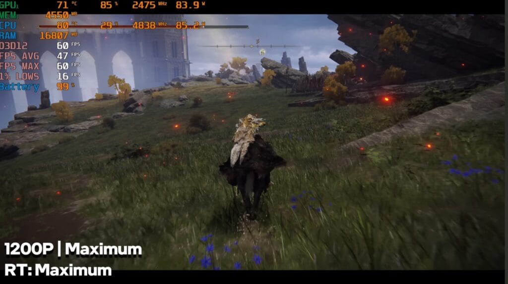 Elden Ring, a 60 FPS locked game, performed at 50–55 FPS average and 59–60 FPS in real-time, delivering smooth and responsive gameplay. The laptop’s CPU and GPU handled it well without excessive heat.