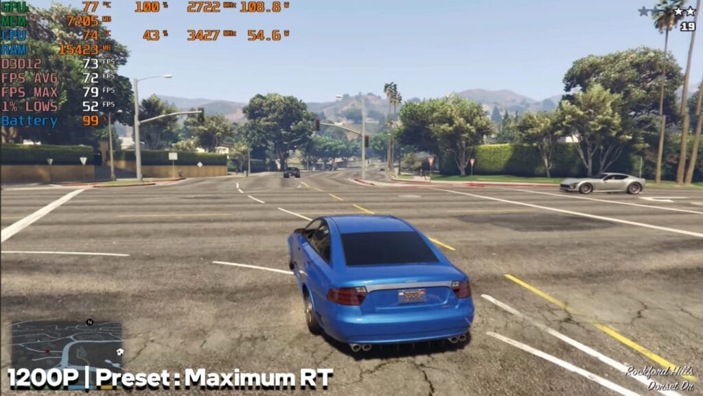 With maximum ray tracing presets, GTA 5 ran at an average of 70 FPS, which is playable for most users. The GPU remained stable, and the laptop thermals stayed under control.