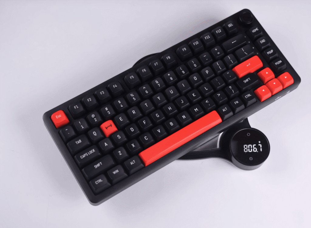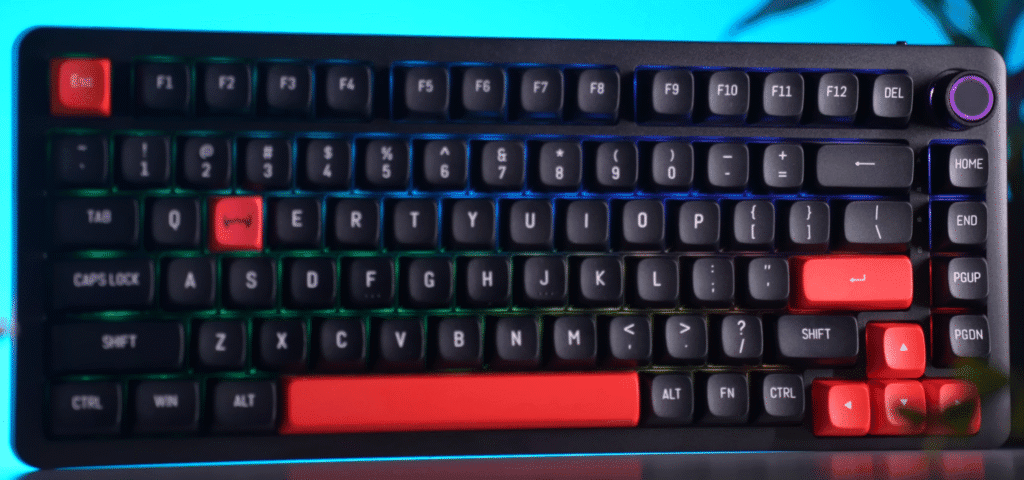 Its 75% layout includes Home, Page Up, Page Down keys, larger keys like the spacebar, Enter, arrow keys, and Escape, while the function keys include multimedia shortcuts for both Windows and Mac. The volume knob is stable, and the entire keyboard is made of polycarbonate.