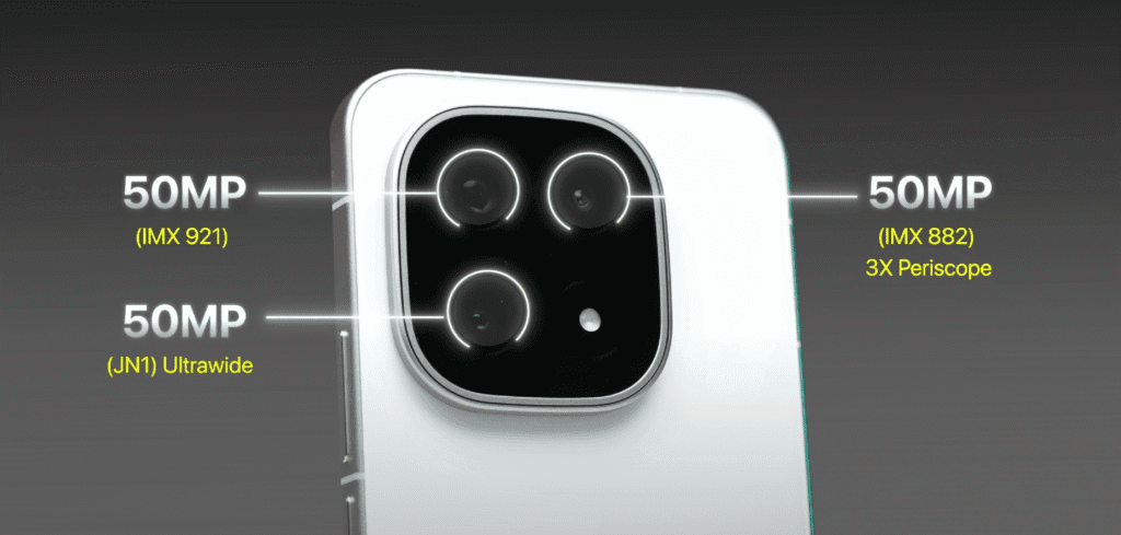 - Telephoto: Sony IMX882 sensor with 50MP and 3x optical zoom