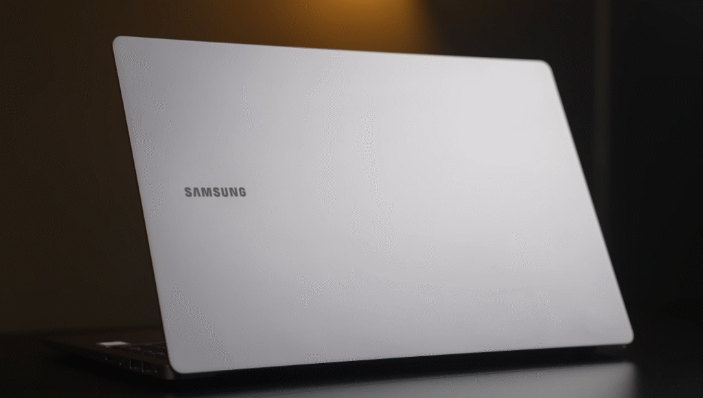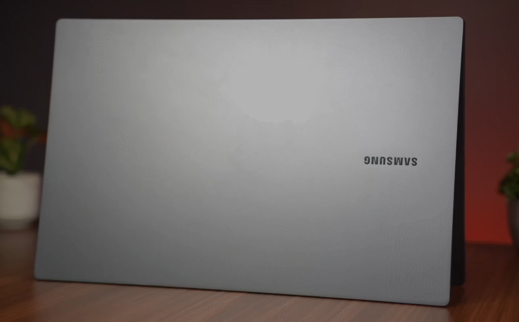 The Samsung Galaxy Book 5 AI features a full-aluminium body, encompassing the lid, base, and palm rest. It feels solid and premium in hand. The top lid has a matte Samsung logo, which looks cleaner than last year’s shinier design.