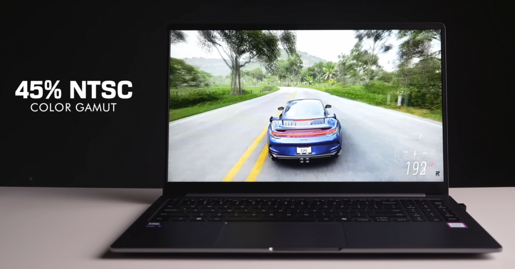 The panel covers 45% NTSC (around 62.5% SRGB). It’s good enough for everyday use, streaming and general content. Colours look lively for an IPS screen, and viewing angles stay stable without noticeable shifts. The display runs at 60 Hz and uses an 8-bit panel, which is typical for this range.