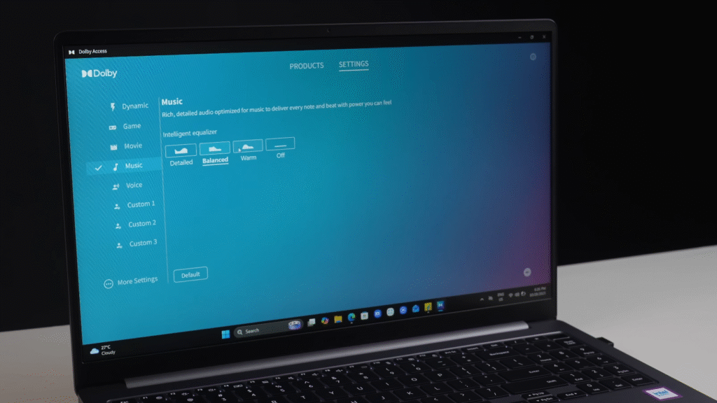 You can use the Dolby Audio app to switch between different presets. The available modes include Movie, Music, Game and Dynamic. Each one changes the sound slightly. Movie mode improves dialogue clarity, while Dynamic adjusts automatically based on what you’re doing. If you connect an external soundbar, Dolby support carries over for a more immersive feel.