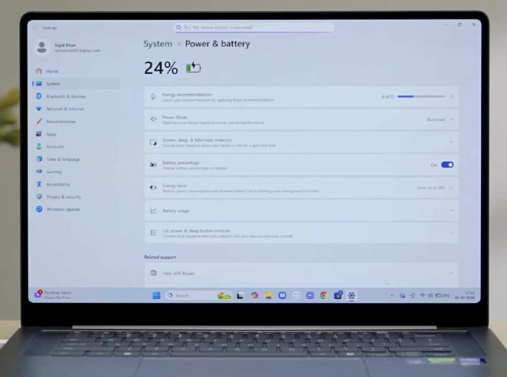 The included 140W USB-C fast charger is also a big advantage. In just about 30 minutes, you can charge the laptop up to around 65–70%, which is perfect if you’re in a hurry. For everyday tasks like browsing, streaming, and working, you can expect up to 15–16 hours of battery life, which is excellent for a machine this powerful.