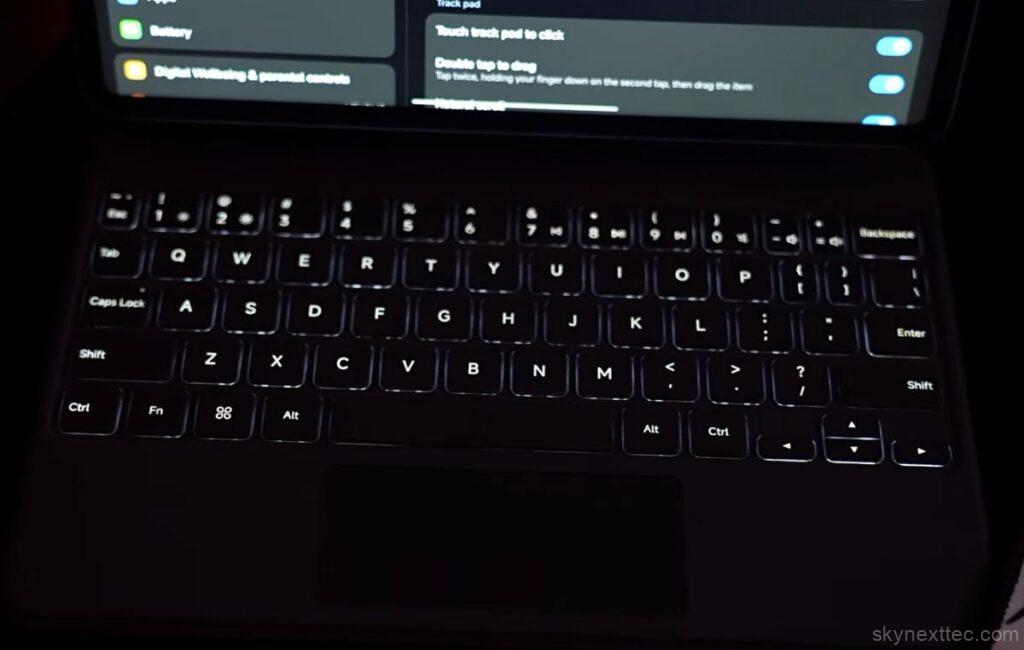 The optional Focus Keyboard is designed to deliver a laptop-like experience. It attaches magnetically using pogo pins and includes a proper hinge, which makes it feel more like a real laptop rather than just a case. You get a 64-key layout, backlit keys, and a trackpad with gesture support. While the trackpad is slightly small, it still performs well in daily use. The hinge allows adjustable viewing angles, although a wider range would have improved comfort further.